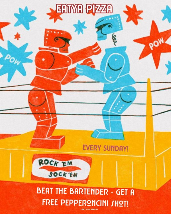 Battle the bartender with the classic Rock'Em Sock'Em game for your chance to win a free pepperoncini shot! (Limit one shot per person, you ...
